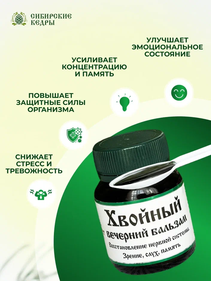 "Хвойный вечерний" бальзам обладает общеукрепляющим, седативным и косметическим действием на человека. Нормализует обменные процессы, обогащает организм полезными микро- и макроэлементами.