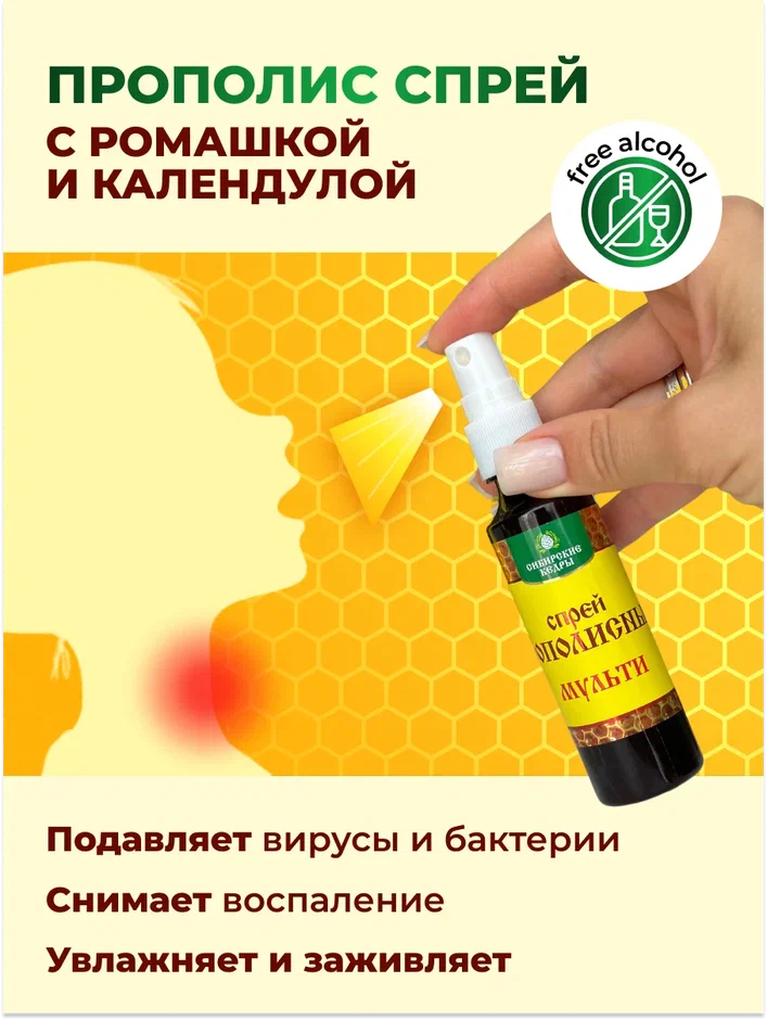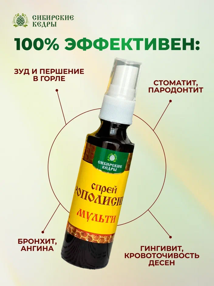 Для усиления эффективности рекомендуется "Спрей прополисный МУЛЬТИ" сочетать с приемом вовнутрь "Живицы Кедровой 10 %", "Огневки" (Восковая моль) или "Бронхолегочного бальзама".