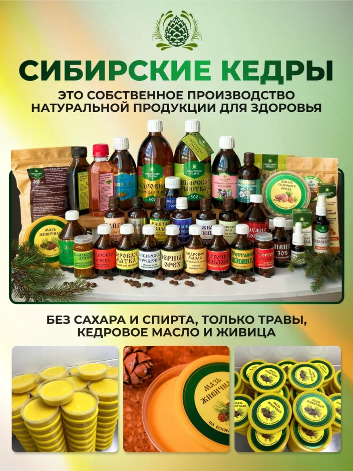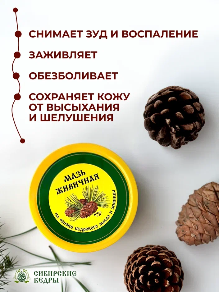 Мазь изготовлена по монастырскому рецепту, основанному на старинных прописях русских травников и целителей. Благодаря своим уникальным заживляющим и восстанавливающим свойствам "Живичная мазь" является практически универсальным целебным средством.