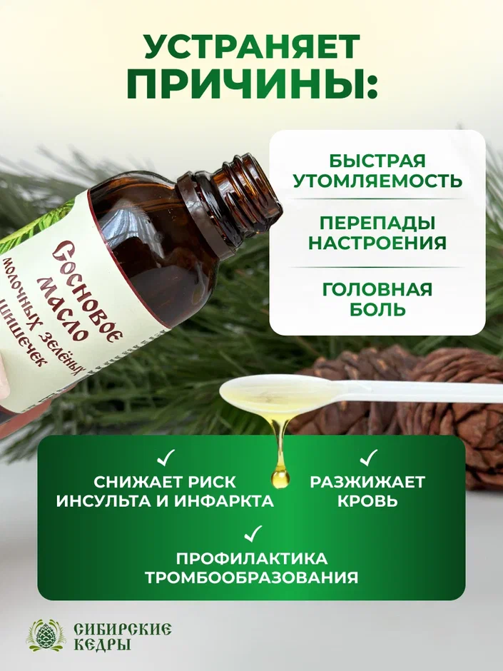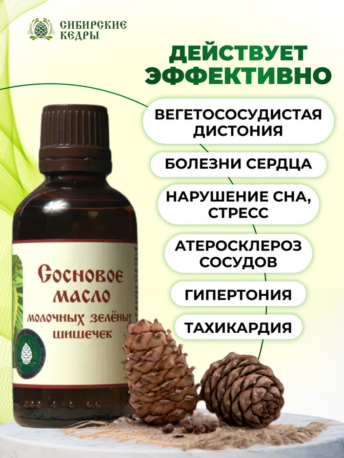Масло молочной шишки сосны богато витаминами: A, B, E, C, K, олеиновой и ленолиевой кислотами, железом, эфирными маслами и липидами. Смолы прекрасно укрепляют сосуды, устраняют боли и воспаления в суставах, способствуют их восстановлению.