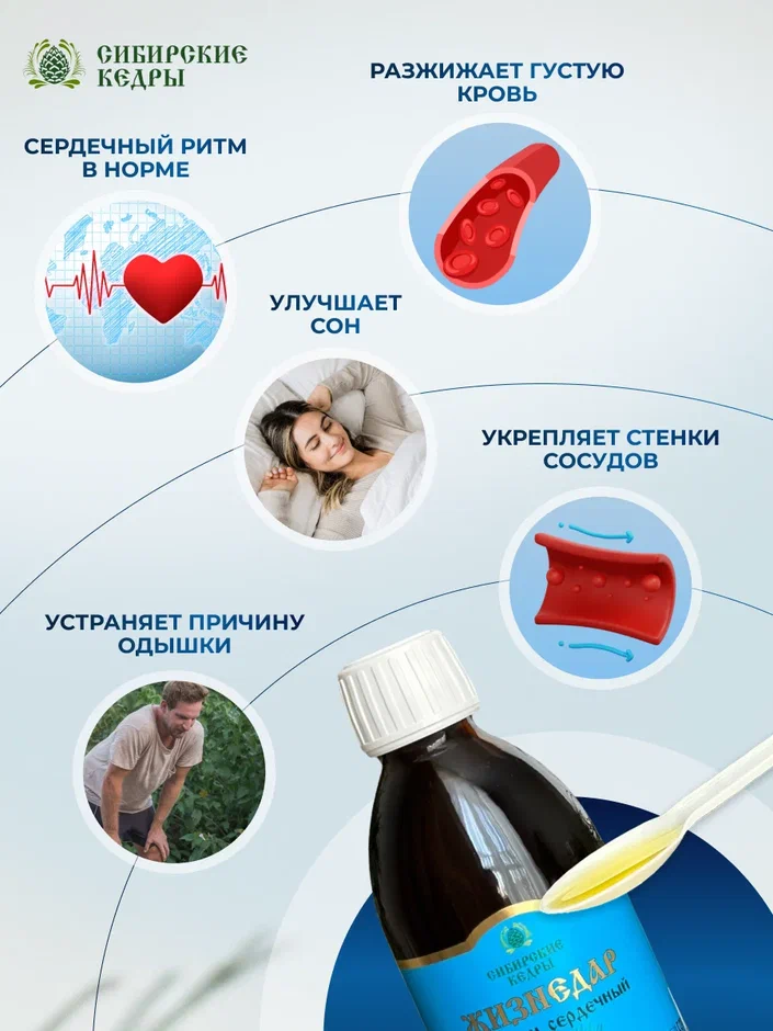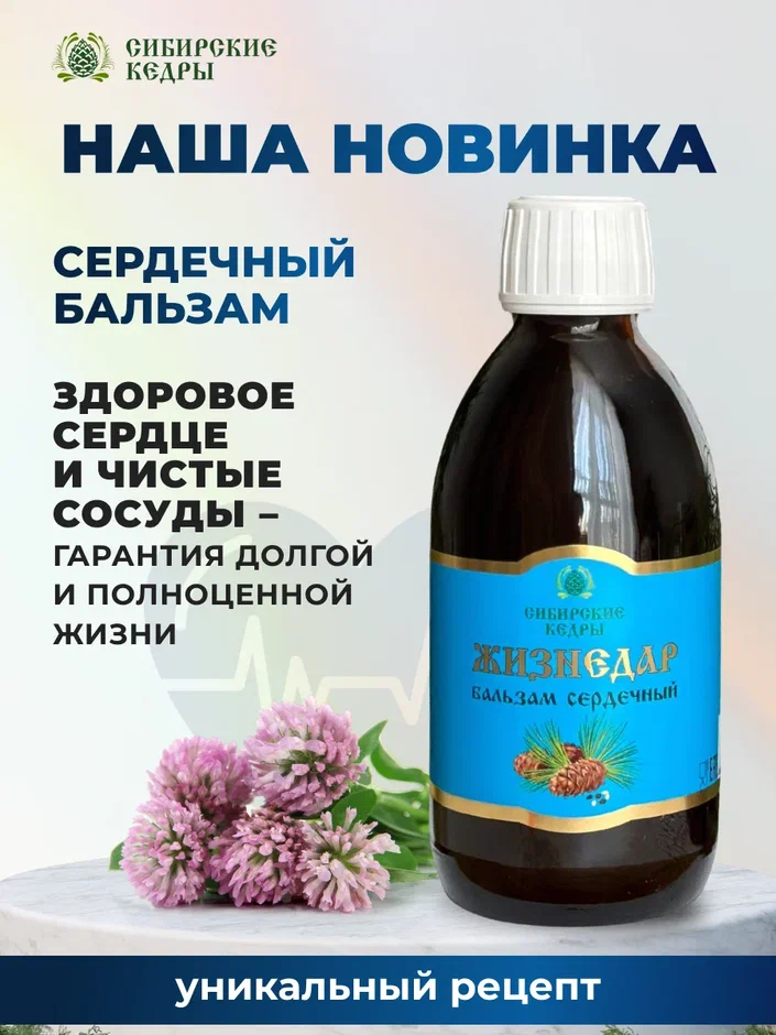 Свойства: опыт древности и современные научные исследования подтверждают эффективность применения ОМЕГА-3 и ОМЕГА-6. Входящее в состав бальзама льняное масло богато этими жирными кислотами, в сочетании с травяным комплексом в составе- это отличная профилактика и эффективное лечение сердечно-сосудистых заболеваний: инфаркт, инсульт, атеросклероз, ишемическая болезнь сердца, гипертония и многих других. Живица кедра, в свою очередь, понижает уровень холестерина в крови, предотвращает воспалительные реакции, ведущие к образованию налета на стенках артерий и нарушениям кровообращения. Сердечный бальзам - лучшее средство для предотвращения преждевременного старения и для сохранения работоспособности сердца на долгие годы!